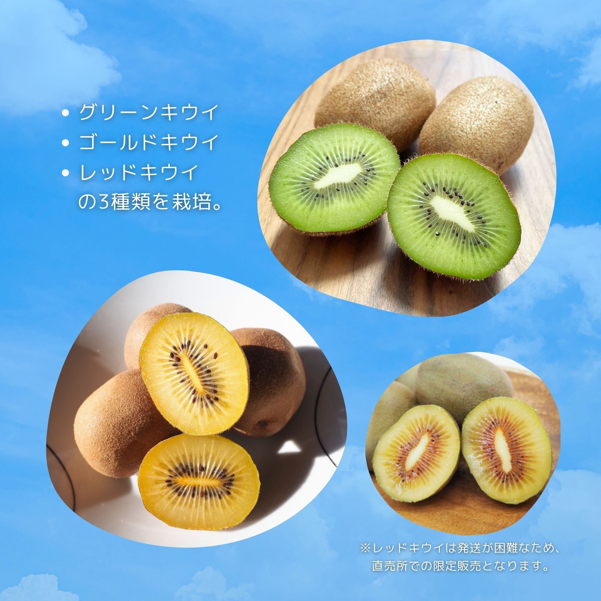 グリーンキウイ、ゴールドキウイ、レッドキウイの3種類を栽培。キウリは甘みと酸味のバランスが良く、ビタミンCや食物繊維が豊富で、美容や健康にとても良いフルーツです。